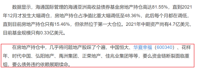 根据报道,海通国际的地产风险敞口其实非常高,以海通亚洲高收益债券基金为例,2020年中旬地产持仓一度超80%,直到2021年年末才发生大幅调仓,房地产持仓占净值比重调至48.36%。此后每个月都在调低,2022年8月时房地产持仓只有15.46%。在其房地产持仓中,踩雷了包括恒大、花样年、华夏幸福、佳兆业、正荣地产等知名房企。