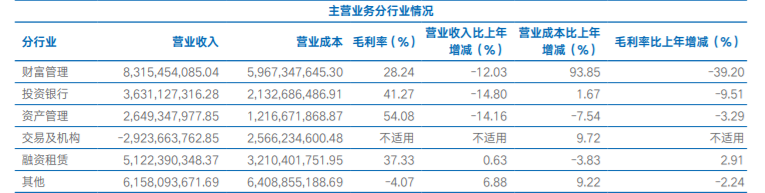 2023年,海通证券三大核心板块业务收入均有下滑。其中,财富管理、投资银行、资产管理业务分别实现营收83.15亿元、36.31亿元、26.49亿元;与上年同期相比,分别下降12.03%、14.8%和14.16%,毛利率分别下降39.2%、9.5%、3.29%。