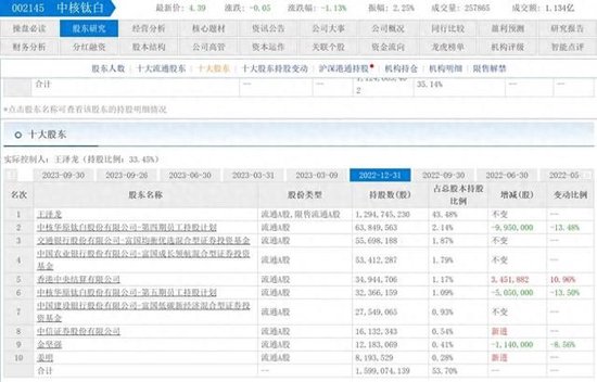 数据显示,截止2022年12月31日,中核钛白十大流通股东名单中,中信证券股份有限公司新进1613万股。