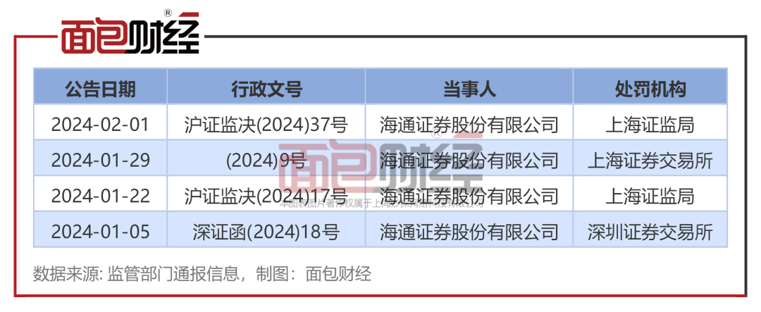 面包财经以处罚公告日统计,2024年第一季度,海通证券收到金融监管部门出具的罚单有4张,其中上海证监局开出罚单2张、交易所开罚单2张。