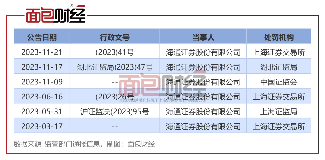 根据监管部门通报信息统计,2023年,金融监管部门向海通证券出具6张罚单,其中证监会及证监会分局开出罚单3张、交易所开罚单3张。
