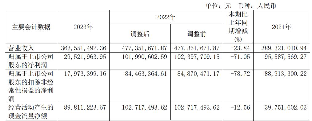 2023年,艾隆科技实现营业收入3.64亿元,同比下降23.84%;归属于上市公司股东的净利润2952.20万元,同比下降71.05%;归属于上市公司股东的扣除非经常性损益的净利润1797.34万元,同比下降78.72%;经营活动产生的现金流量净额为8981.12万元,同比下降12.56%。