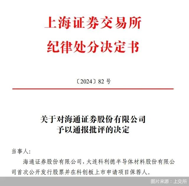 蓝鲸新闻记者关注到,5月8日,上交所发布公告表示,因对拟IPO企业大连科利德半导体材料股份有限公司(以下简称“科利德”)保荐核查工作履职尽责不到位,上交所对海通证券(600837.SH;06837.HK)及2名保荐代表人予以通报批评。发行人科利德、容诚会计师事务所也被罚。