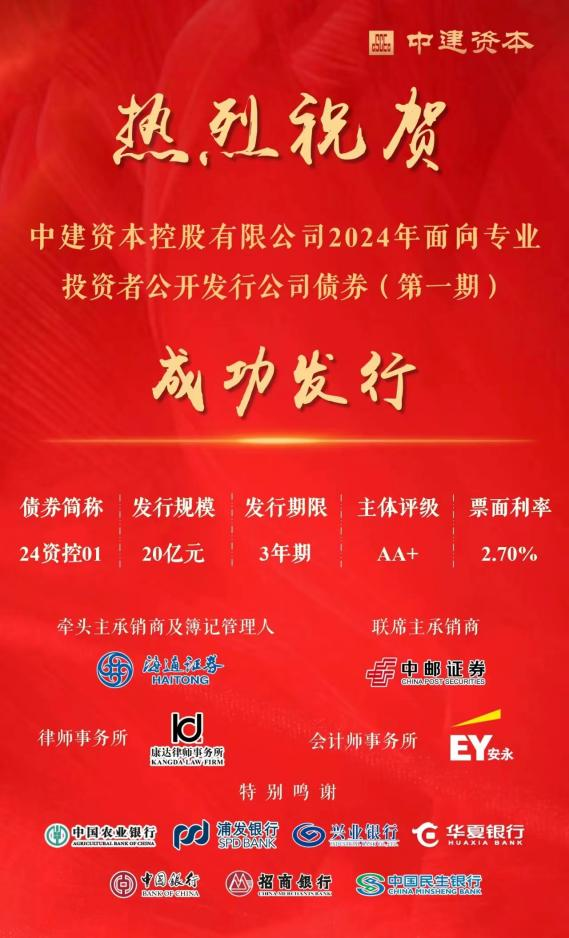 近日,海通证券作为牵头主承销商及簿记管理人,助力中建资本控股有限公司(以下简称中建资本)成功发行2024年面向专业投资者公开发行公司债券(第一期),发行规模20亿元,期限3年,票面利率2.70%。债券簿记当日,吸引众多银行及非银机构积极参与认购,创2023年以来同评级央企公司债券发行最大规模。