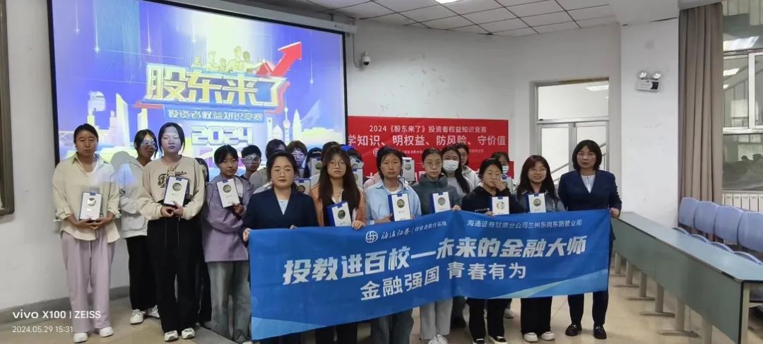 随着金融行业的快速发展,金融知识普及和投资者教育显得尤为重要。为更好的推进将投资者教育纳入国民教育体系这一目标,落实“投资者教育进百校”专项活动。海通证券投教基地携手甘肃分公司于2024年5月29日走进兰州财经大学会计学院组织开展“未来的金融大师——金融强国青春有为”投教进百校专题活动暨《股东来了》(2024)投资者权益知识竞赛活动。本次活动由海通证券甘肃分公司兰州东岗东路营业部承办,活动参与人数共计 110人。