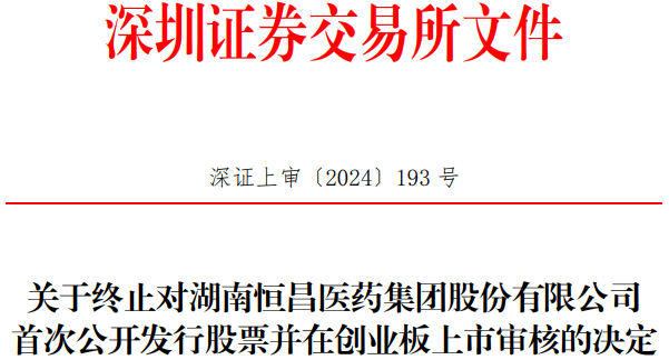 深交所网站昨日发布关于终止对湖南恒昌医药集团股份有限公司(以下简称“恒昌医药”)首次公开发行股票并在创业板上市审核的决定。