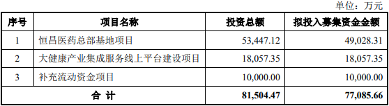恒昌医药原拟在深交所创业板公开发行股票数量不低于4,001.00万股,不超过12,000.00万股,全部为新股发行,原股东不公开发售股份。恒昌医药原拟募集资金77,085.66万元,分别用于恒昌医药总部基地项目、大健康产业集成服务线上平台建设项目和补充流动资金项目。