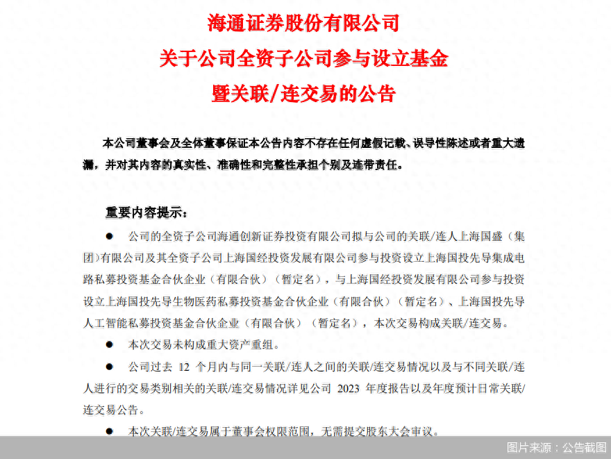 7月5日,海通证券发文称,公司的全资子公司海通创新证券投资有限公司拟与公司的关联/连人上海国盛(集团)有限公司及其全资子公司上海国经投资发展有限公司参与投资设立上海国投先导集成电路私募投资基金合伙企业(有限合伙)(暂定名),与上海国经投资发展有限公司参与投资设立上海国投先导生物医药私募投资基金合伙企业(有限合伙)(暂定名)、上海国投先导人工智能私募投资基金合伙企业(有限合伙)(暂定名),本次交易构成关联/连交易。
