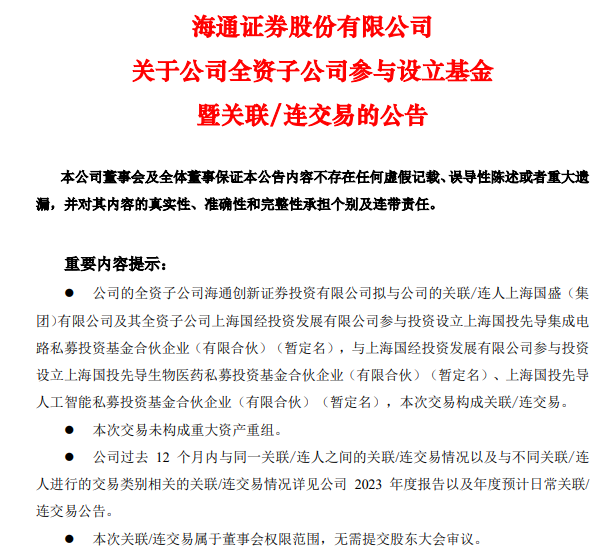 此外,国泰君安实际控制人上海国际集团有限公司,海通证券的关联/连人上海国盛(集团)有限公司及其全资子公司上海国经投资发展有限公司,均拟出资参与投资设立上海三大先导产业母基金。