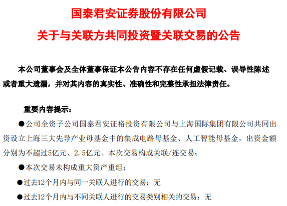 国泰君安公告称,全资子公司国泰君安证裕投资有限公司拟出资不超过人民币10亿元参与投资设立上海三大先导产业母基金,具体为:集成电路母基金出资不超过5亿元、生物医药母基金出资不超过2.5亿元、人工智能母基金出资不超过2.5亿元。