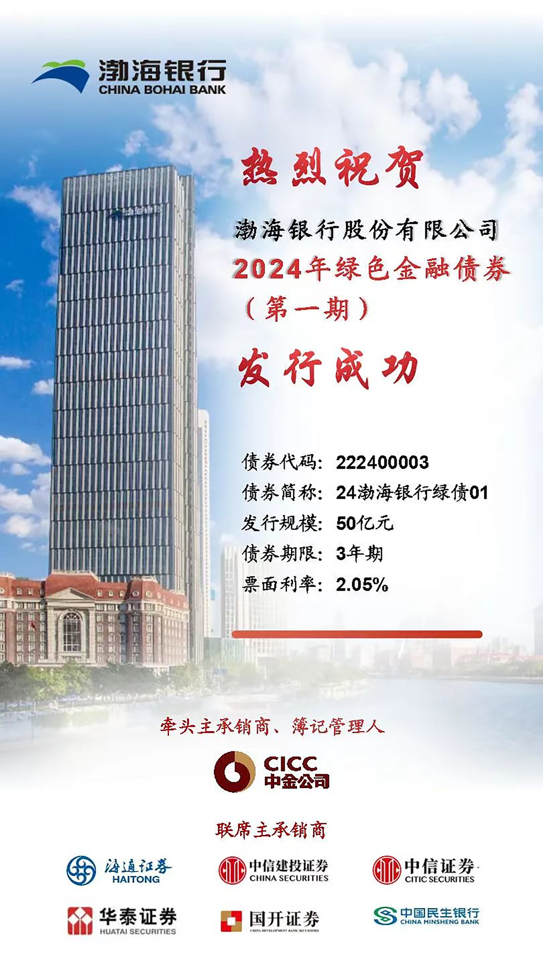近日,海通证券作为联席主承销商,助力渤海银行股份有限公司(9668.HK)(以下简称渤海银行)成功发行首单绿色金融债券,发行规模50亿元,期限3年,票面利率2.05%。本期债券获投资者热烈反响,全场认购倍数达4.4倍,充分体现市场对渤海银行良好经营情况与资信状况的高度认可。