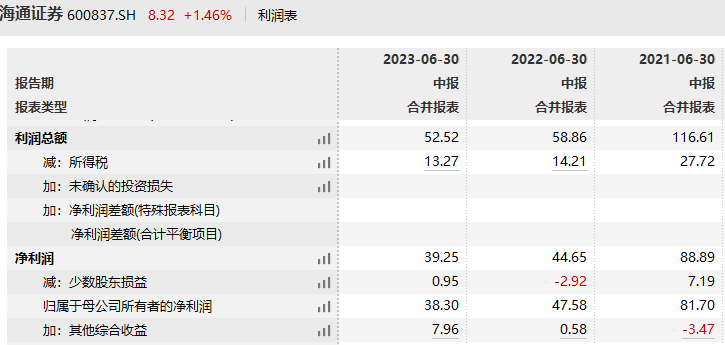 数据显示,这是海通证券中报归母净利润连续第三年同比下降。