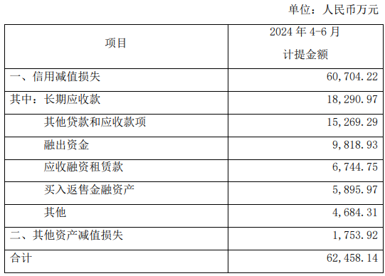 公告称,经初步评估,公司2024年4-6月计提信用减值损失人民币约6.07亿元,计提其他资产减值损失人民币1753.92万元,合计计提资产减值损失人民币6.25亿元,对净利润的影响超过公司2023年经审计净利润的10%(下图)。