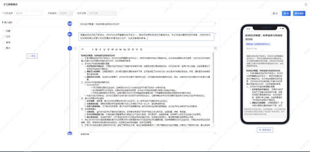 依托丰富的投顾专业知识资源,海通证券构建了投顾业务场景下的高效智能问答,迅速响应投顾人员的信息需求,显著提升其面对客户咨询时的即时响应能力,并推动服务流程的标准化与高效化。同时充分利用“e海言道”大模型在文本生成及图文转换方面的卓越能力,创新性地应用于投顾资讯的创作流程中,自动化生成初步的投资顾问观点资讯稿,由投顾人员对自动生成的初稿进行精细化加工与严格审核,确保资讯内容的专业性、时效性与准确性,从而全面提升投顾服务的品质与效率。