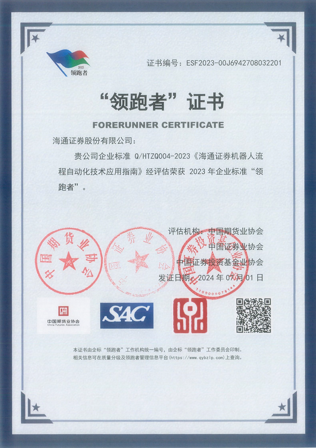 为发挥企业标准“领跑者”标杆引领作用,鼓励证券期货业经营机构公开高水平的企业标准,提升服务实体经济和防范金融风险的能力,证券、期货、基金三家行业协会共同开展了2023年度金融信息服务领域移动金融客户端应用(证券期货业金融机构)、智慧金融服务(证券期货业金融机构)企业标准“领跑者”评估工作。近日,经过评估及公示,海通证券企业标准Q/HTZQ004-2023《海通证券机器人流程自动化技术应用指南》荣获2023年企业标准“领跑者”。