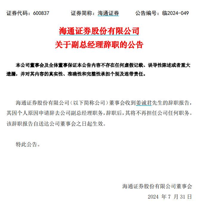 7月31日,海通证券公告称,该公司董事会收到姜诚君的辞职报告,其因个人原因申请辞去海通证券副总经理职务,辞职后,其将不再担任该公司任何职务。该辞职报告自送达公司董事会之日起生效。