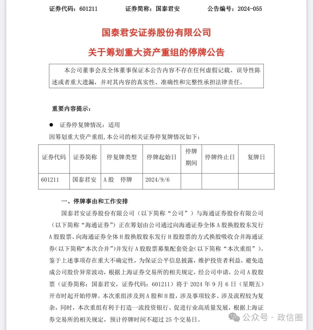 9月5日晚间,国泰君安证券、海通证券均发布停牌公告,拟筹划重大资产重组,股票明日起停牌。