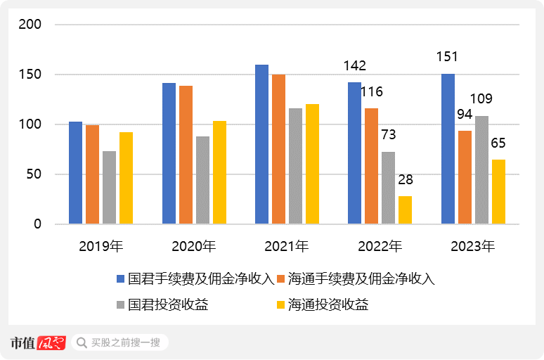 国泰君安这两项收入近年有波动,但变动不算大,海通证券则可以用加速坠落来形容。