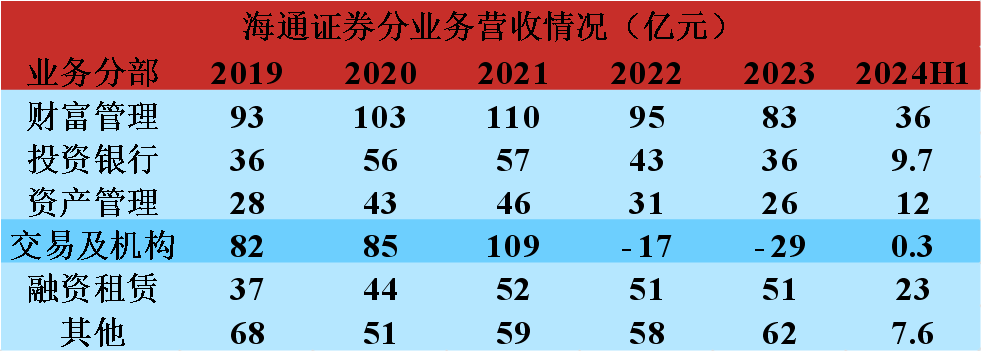 2019-2021年,交易及机构业务收入年均90亿元左右,2022年这块业务亏损17亿元,2023年继续亏损29亿元,今年上半年公司这块业务没实现什么收入。