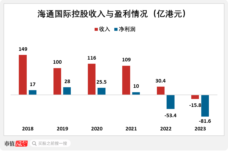 2018-2021年,海通国际每年的收入在100亿港元以上,年均盈利在20亿港元左右。2022、2023两年,海通国际控股收入分别为30亿港元、-16亿港元,而这两年合计亏损达到135亿港元,约合人民币120多亿元。