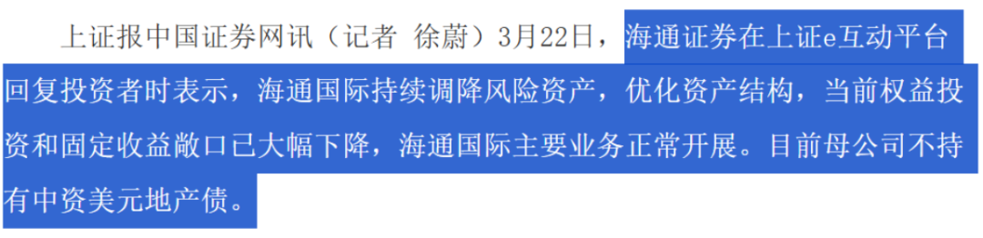 海通证券曾于2023年3月22日在e互动平台上回复投资者时表示,目前母公司不持有中资美元地产债。