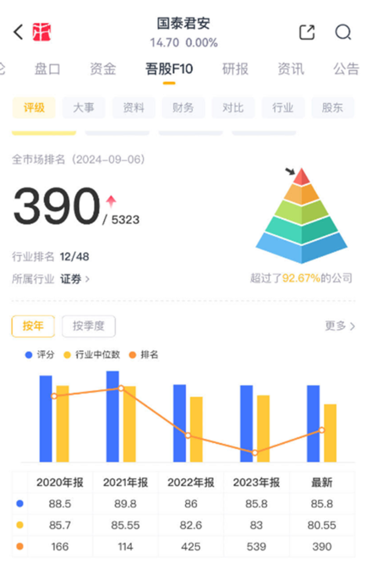2022年,情况类似,海通和国泰君安的吾股排名略微分化,分别为685和425。