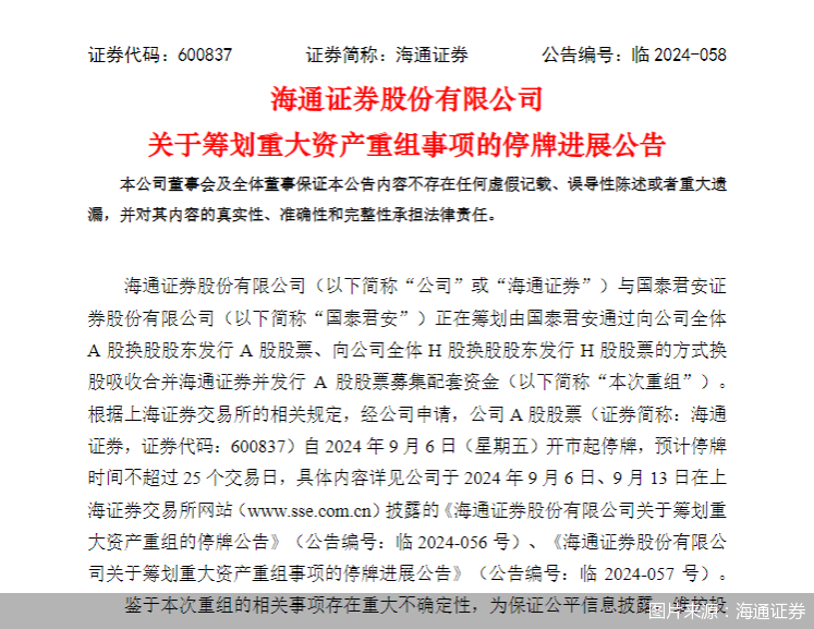 9月23日,海通证券发布公告表示,与国泰君安正在筹划由国泰君安通过向公司全体A股换股股东发行A股股票、向公司全体H股换股股东发行H股股票的方式换股吸收合并海通证券并发行A股股票募集配套资金(以下简称“本次重组”)。