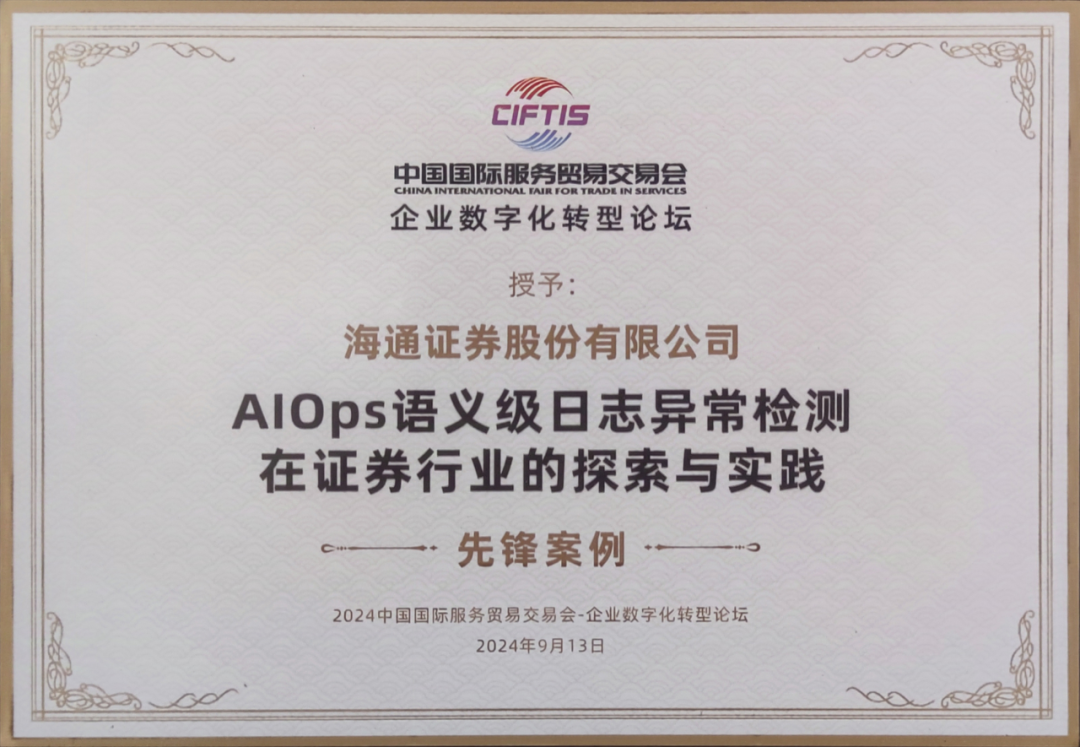 会上公布了2024企业数字化转型论坛年度“数智影响力”征集结果,海通证券凭借其“AIOps语义级日志异常检测在证券行业的探索与实践”项目,在众多参评作品中脱颖而出,荣获“数智影响力”数字化转型先锋案例奖。