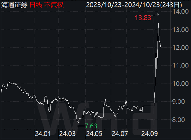 10月18日,海通证券A股股价最高涨至13.83元,较9月5日即停牌前最后一个交易日收盘价上涨57.7%。