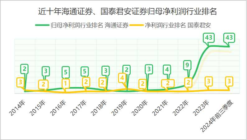 在2015年之前,海通证券堪称现在的国泰君安的翻版,虽然营收比不过国泰君安,但是归母净利润优势明显。但在2015年之后,虽然海通证券的营收规模大幅增长,多数年份的归母净利润均明显低于国泰君安。2024年三季度末,海通证券的归母净利润已经跌至43家A股主板上市券商末位。