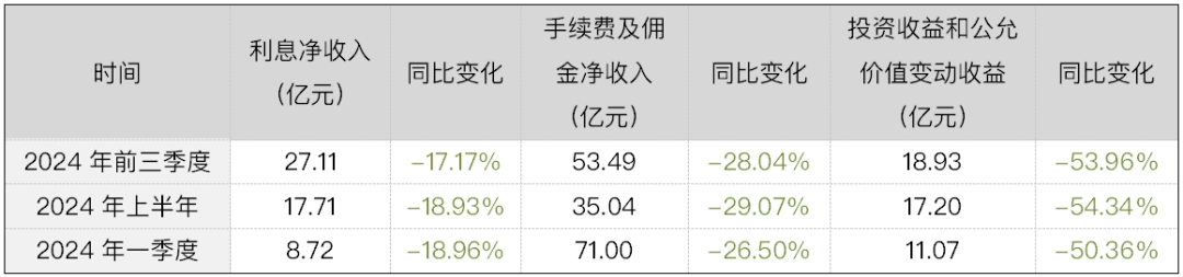 反映在营收上,海通证券已经大不如从前。2024年前三季度海通证券的利息净收入、手续费及佣金净收入、投资收益分别为27.11亿元、53.49亿元、34.07亿元,均较上年同期下滑幅度超过17%。