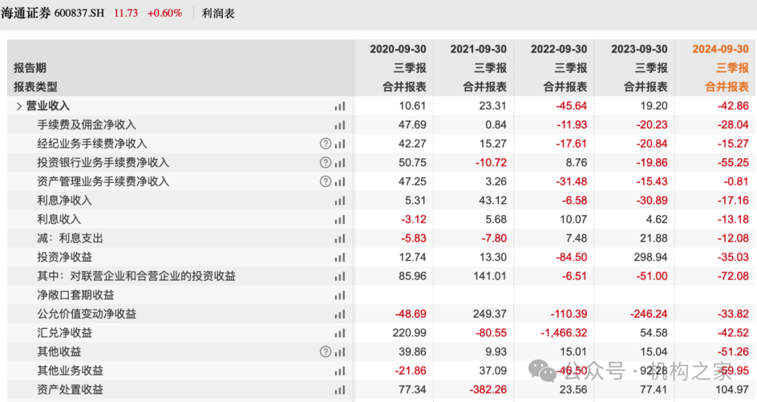 此次海通证券三季报亏损,主要归结于营收的下滑。细究海通证券2024年三季报数据,其主要收入呈现全面下滑态势。数据显示,公司手续费及佣金净收入为53.49亿元,较2023年同期的74.33亿元下降28.04%。其中,经纪业务手续费净收入降至24.35亿元,同比下滑15.27%;投行业务手续费净收入仅为13.48亿元,同比下滑55.25%;资管业务手续费净收入14.16亿元,同比下滑0.81%。自营业务方面,2024年前三季度,公司实现投资净收益34.07亿元,较去年同期的52.43亿元下降35.02%;公允价值变动净收益为-15.14亿元,较去年同期的11.31亿元亏损进一步扩大。