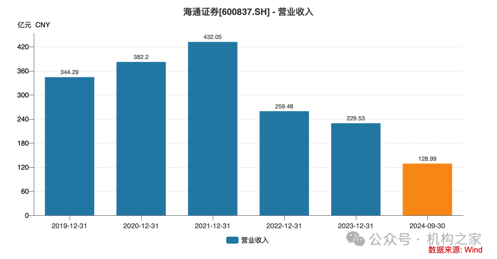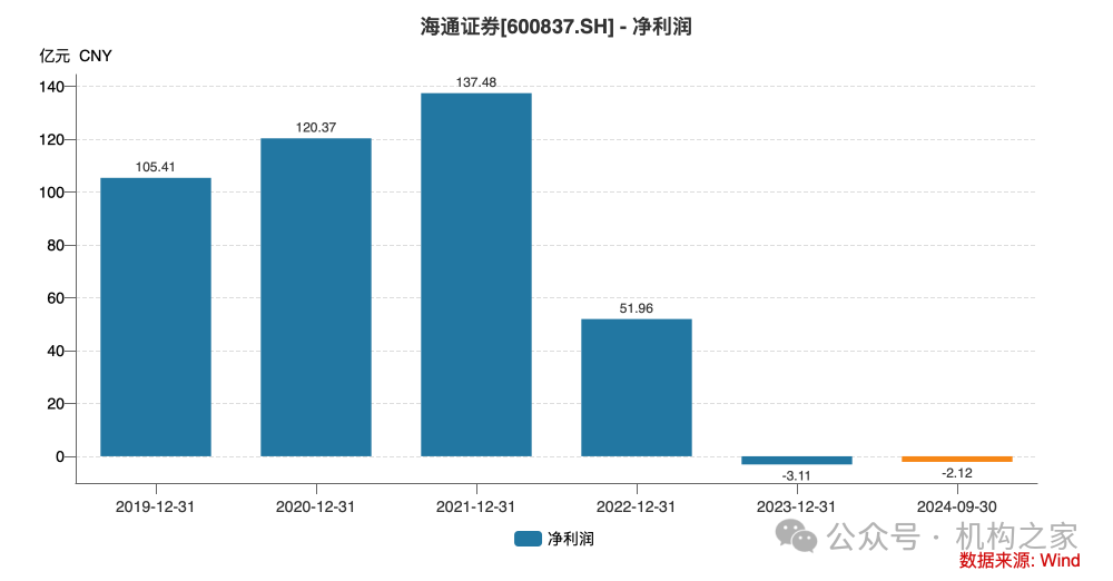 细究海通证券的经营状况。2023年,海通证券实现营业收入229.53亿元,同比下降11.54%;净亏损达3.11亿元。值得注意的是,这种颓势在2024年并未得到根本性扭转,反而有愈演愈烈之势。今年前三季度,公司营业收入仅为128.99亿元,较上年同期的225.74亿元下滑42.86%;净亏损为2.12亿元,归属于母公司股东的净亏损更是达到了6.59亿元。