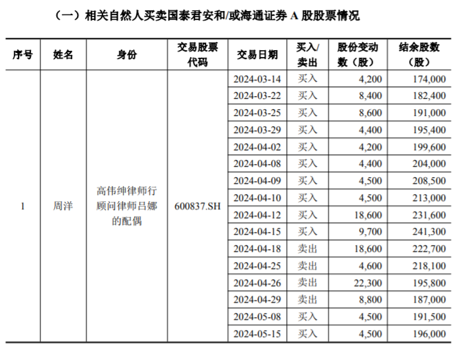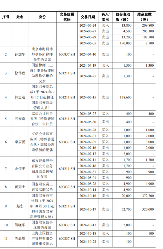 结果显示,涉及11名相关自然人买卖国泰君安和海通证券的A股股票。包括国泰君安的副总裁韩志达、总审计师赵宏、监事沈赟的母亲熊晓华、员工黄文欣的父亲黄冠土,以及海通证券的境外法律顾问高伟绅律师行的顾问律师吕娜的配偶周洋等。
