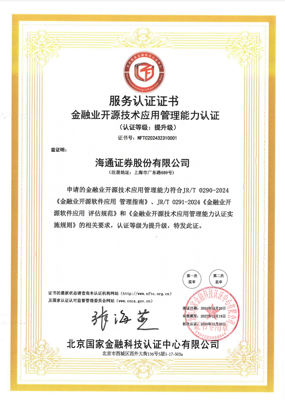 12月24日,在山东青岛举办的财富论坛·数字金融论坛上,海通证券荣获北京国家金融科技认证中心颁发的“金融业开源技术应用管理能力认证”提升级认证证书,成为行业首批通过该认证的证券公司之一。此次认证通过,充分体现了海通证券开源治理能力成熟度迈上新台阶,标志着海通证券开源治理能力达到行业领先水平。
