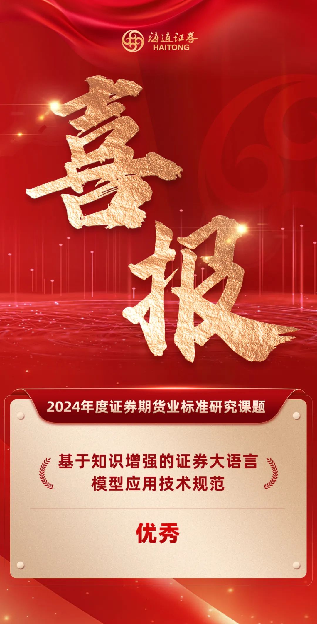 近期,2024年度证券期货业标准研究课题结题评审结果公布,此次共评审72项课题,15项研究课题评审结果为“优秀”。海通证券牵头完成的《基于知识增强的证券大语言模型应用技术规范》评定为“优秀”。
