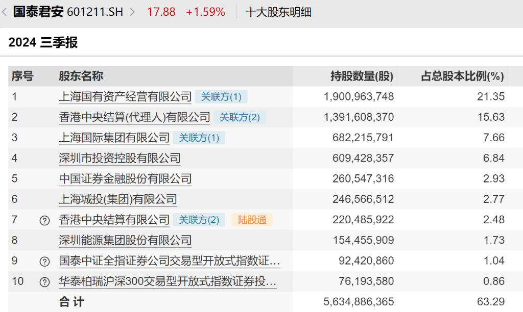 根据两家券商3季报,上海国际集团目前是国泰君安的第三大股东,持股比例约7.66%。同时,上海国际集团又100%持股上海国有资产经营有限公司。后者也持有国泰君安约21.35%的股权。