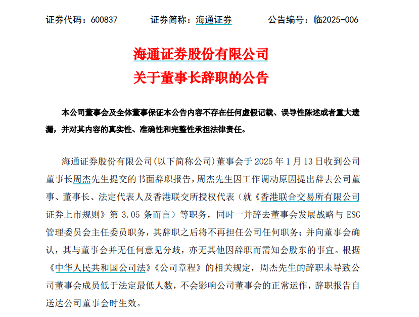 1月13日晚间,海通证券发布公告称,1月13日收到公司董事长周杰提交的书面辞职报告,因工作调动原因周杰提出辞去公司董事、董事长、法定代表人及香港联交所授权代表等职务,同时一并辞去董事会发展战略与ESG管理委员会主任委员职务,其辞职之后将不再担任公司任何职务。