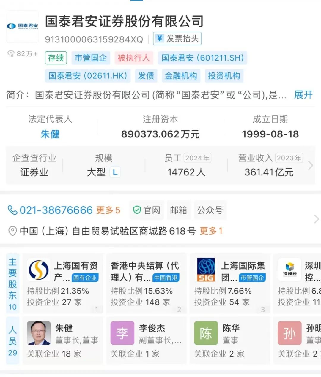 值得一提的是,上海国际集团正是国泰君安证券背后大股东。数据显示,上海国际集团目前直接持有国泰君安证券7.66%股份,并通过上海国有资产经营有限公司间接持股21.35%,合计持股29.01%。