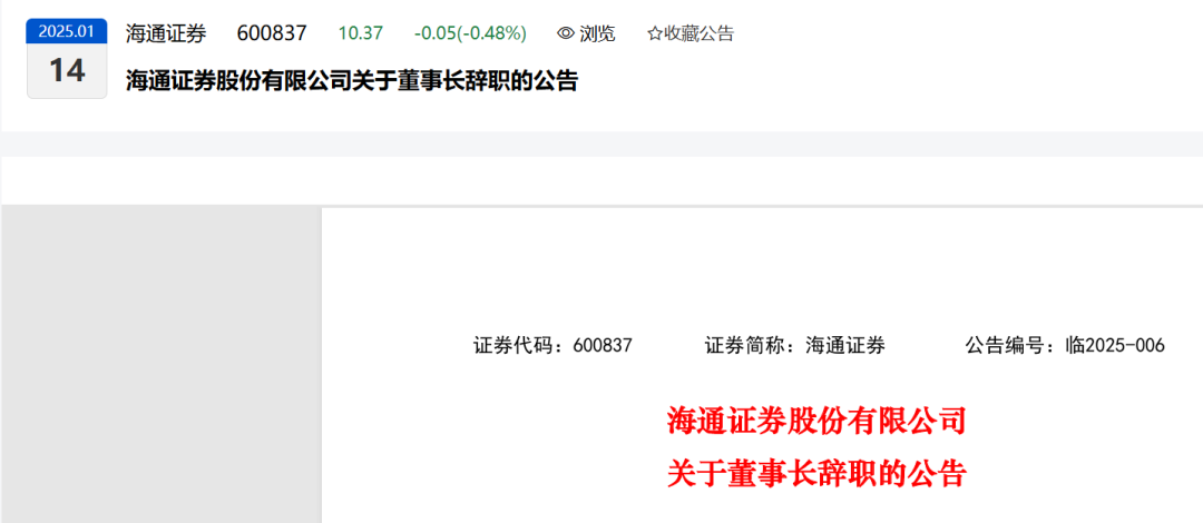 海通证券股份有限公司董事会于2025年1月13日收到公司董事长周杰先生提交的书面辞职报告,周杰先生因工作调动原因提出辞去公司董事、董事长、法定代表人及香港联交所授权代表(就《香港联合交易所有限公司证券上市规则》第3.05 条而言)等职务