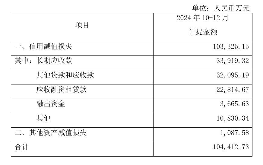 2024 年10-12月计提应收融资租赁款减值准备人民币2.28亿元。对于融资租赁业务,根据应收融资租赁款的信用风险变化评估预期信用损失并确定相应的信用损失准备,采用违约概率/违约损失率法或单项测试计算预期信用损失,计提减值准备。