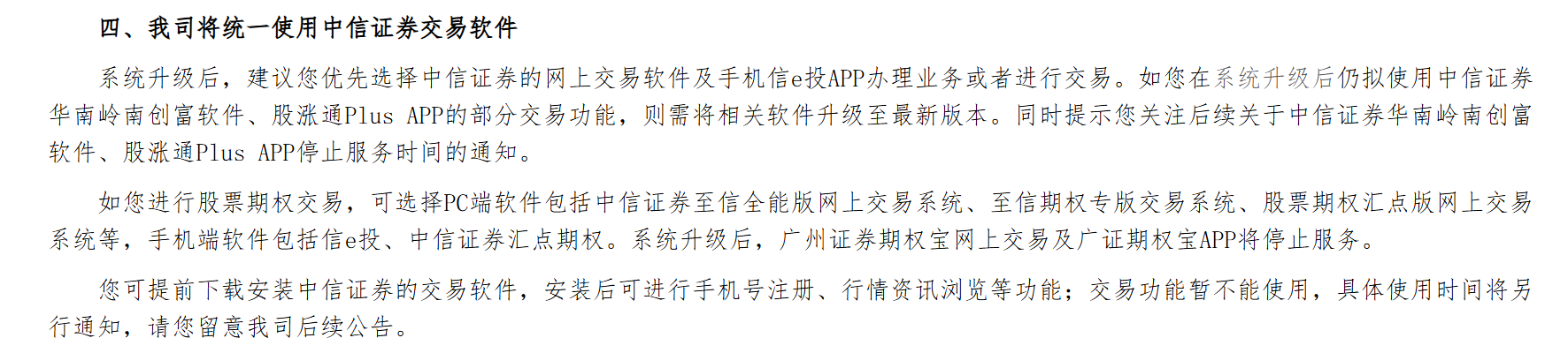 2020年4月24日,中信证券华南发布公告,公司集中交易系统定于2020年5月1日进行升级。公告中,中信证券华南明确告知客户,“我司将统一使用中信证券交易软件”,并提示投资者关注后续关于中信证券华南岭南创富软件、股涨通Plus APP停止服务时间的通知。在这次升级后,中信证券华南首先停止了期权宝APP的服务。