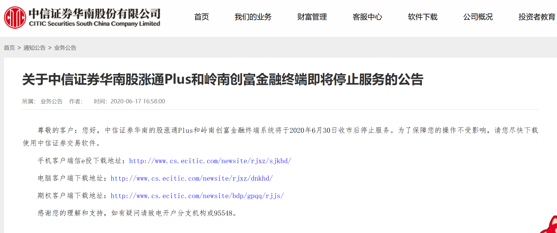 2020年6月17日,中信证券华南发布公告,中信证券华南的股涨通Plus和岭南创富金融终端系统于2020年6月30日收市后停止服务,并提示投资者下载中信证券软件。