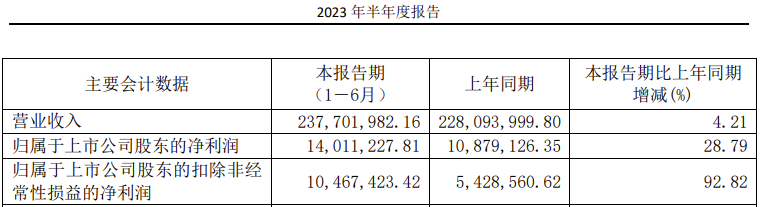 公司2023年上半年营收同比增长4.21%,扣非净利润1047万元,同比增长92.82%。