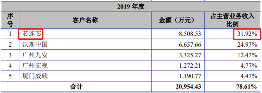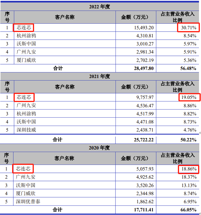 公司申报科创板IPO于2022年6月10日获得受理。据公司数版招股书披露,公司第一大客户均为注册于中国香港的芯连芯国际有限公司。2019年、2020年、2021年、2022年,芯连芯对公司贡献收入占比分别为31.92%、18.86%、19.05%、30.71%。