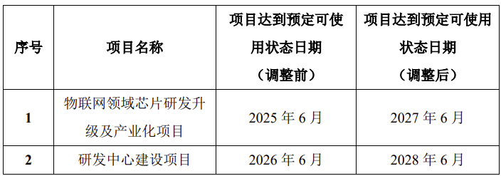 2025年2月18日,公司发布《关于募集资金投资项目延期的公告》。物联网领域芯片研发升级及产业化项目“达到预定可使用状态日期”从原定的2025年6月延期至2027年6月,研发中心建设项目从原定的2026年6月延期至2028年6月,各延后了两年。