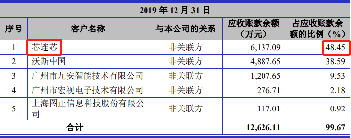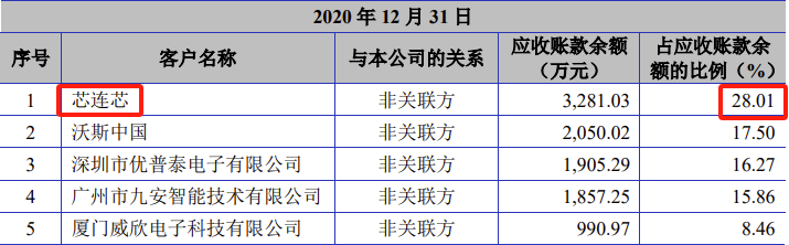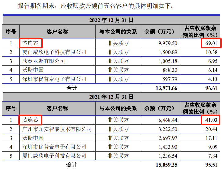 2019年末、2020年末、2021年末、2022年末,芯连芯都是公司应收账款客户的第一名,公司对芯连芯的应收账款余额占公司总应收账款余额的比例分别为48.45%、28.01%、41.03%、69.01%。而同期芯连芯对公司贡献的收入占比分别为31.92%、18.86%、19.05%、30.71%。特别是2022年末,芯连芯对公司应收账款余额占比高达69.01%,但2022年芯连芯贡献收入占比为30.71%,两者相差一倍还多。