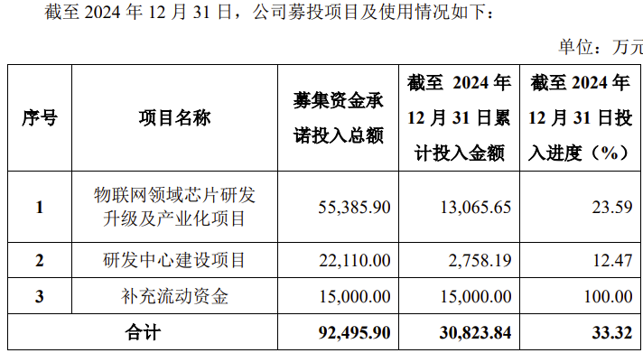 除1.5亿补充流动资金以外,公司IPO募投项目有两个:物联网领域芯片研发升级及产业化项目、研发中心建设项目,募集资金承诺投入总额分别为55385.90万元、22110.00万元。截至2024年12月31日,投入进度分别为23.59%、12.47%。