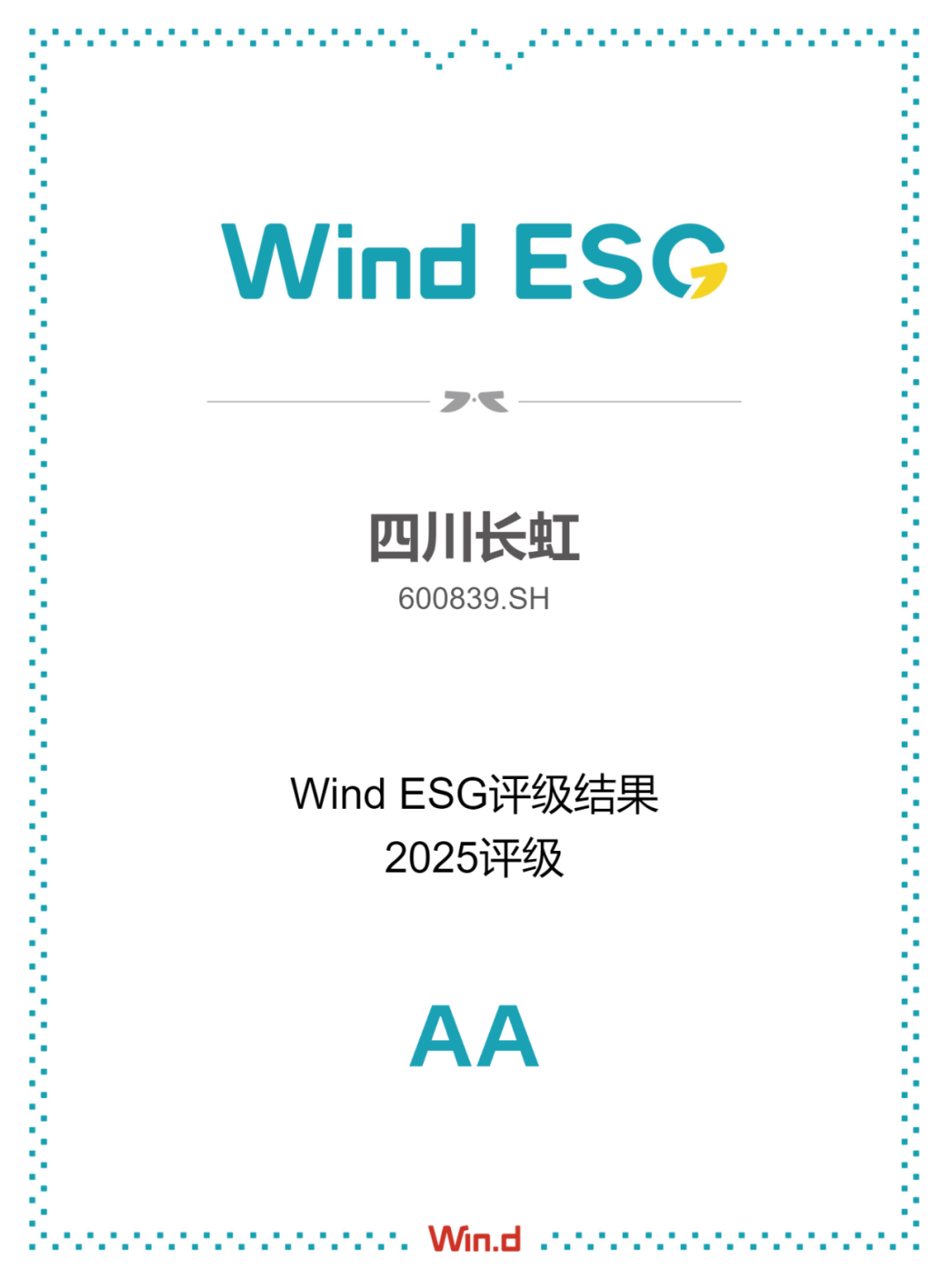 近日,国内权威ESG评级机构Wind(万得)发布2025年最新评级结果,四川长虹电器股份有限公司(股票代码:600839)凭借卓越的ESG表现,从A级提升至AA级,ESG综合得分升至8.56(10分制),在117家家庭耐用消费品类上市公司中跃升至第4名,在5000多家A股上市公司中处于领先水平,这体现了公司深度践行ESG理念,展现了公司卓越的ESG治理水平和强劲的可持续发展实力。