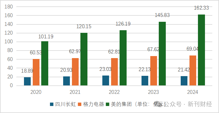 在研发方面,四川长虹与行业头部企业存在显著差距,近五年其年均研发费用为21.28亿元,格力电器研发费用年均64.59亿元,为长虹的3.04倍;而美的集团持续提升投入,2024年同比增长11.31%至162.33亿元,为长虹同期研发支出的7.58倍。三家企业研发投入规模的差距,直观反映了技术储备与创新投入的战略差异。另外,四川长虹近五年研发费用率在2.10%左右,而格力电器与美的集团研发费用率处于3.30%至3.97%之间,最高值与四川长虹相差近一倍。四川长虹研发投入的不足,可能导致其在核心技术和产品差异化上突破速度较慢,难以推出更多的具备高端竞争力的自有品牌产品。